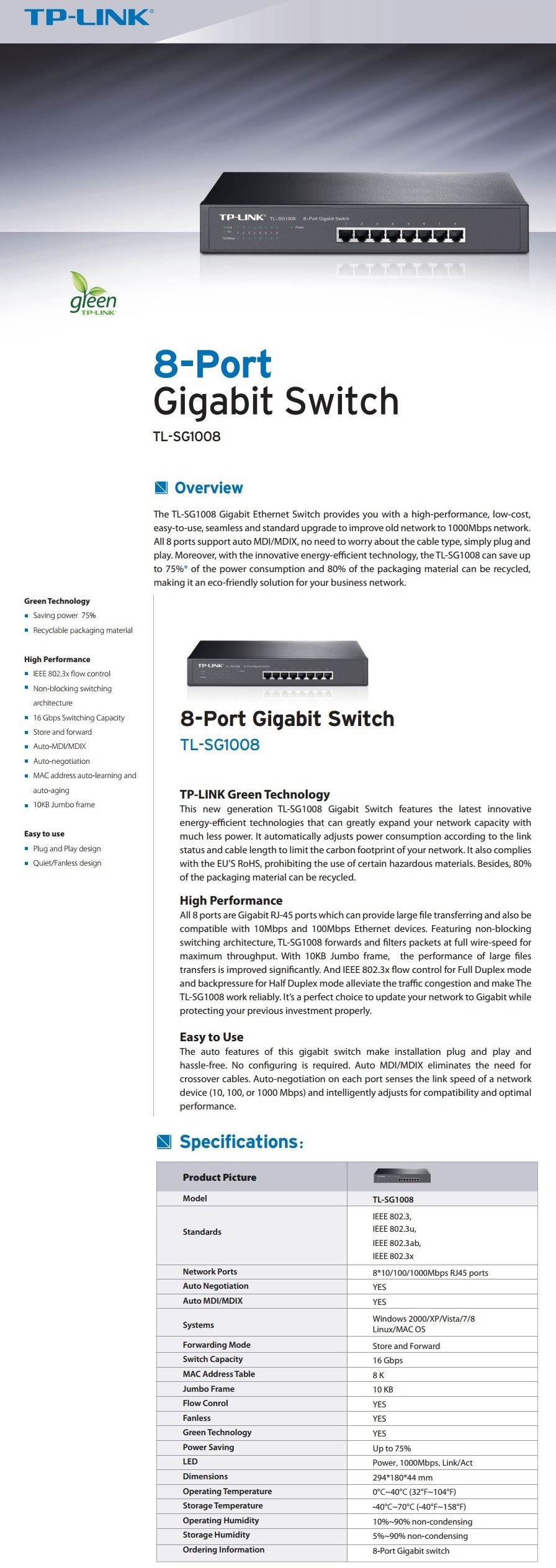 The TL-SG1008 8-Port Gigabit desktop/rack-mount switch provides an easy way to make the transition to Gigabit Ethernet. All 8 ports support auto MDI/MDIX, no need to worry about the cable type, simply plug and play. Moreover, with the innovative energy-efficient technology, the TL-SG1008 can save up to 60%* of the power consumption, making it an eco-friendly solution for your business network. Featured with 8 10/100/1000Mbps ports, TL-SG1008 greatly expands your network capacity, enabling instant large files transferring. So, power users in the home, office, workgroup, or creative production environment can now move large, bandwidth-intensive files faster. Transfer graphics, CGI, CAD, or multimedia files across the network instantly.